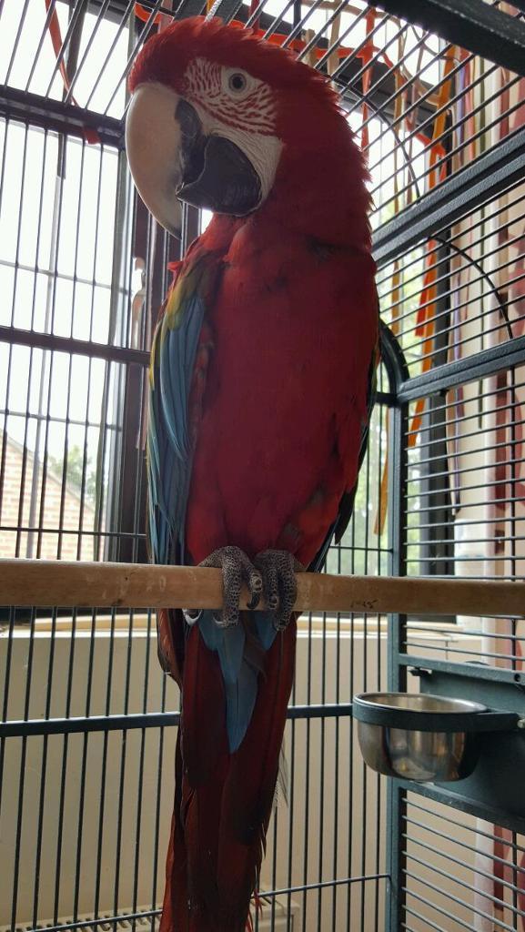 She will come with big cage (on the picture) + food. She not very time . She got a born twisted wing which is showing in picture. The vet say that is Angeles wings. She is healthy and strong bird. She is shy and not always talking. But when you know you she will talk.