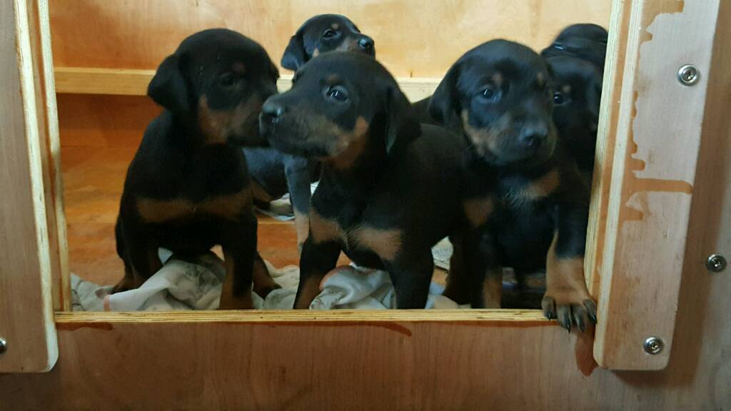 Hi here is my litter of doberman puppies kc registered 4 boys and 3 girls black and tan excellent blood lines will go with 8 weeks free insurance and kennel club documents deposit will secure we have 7 individual colour collars so you can put the colour on so you know which is your doberman
