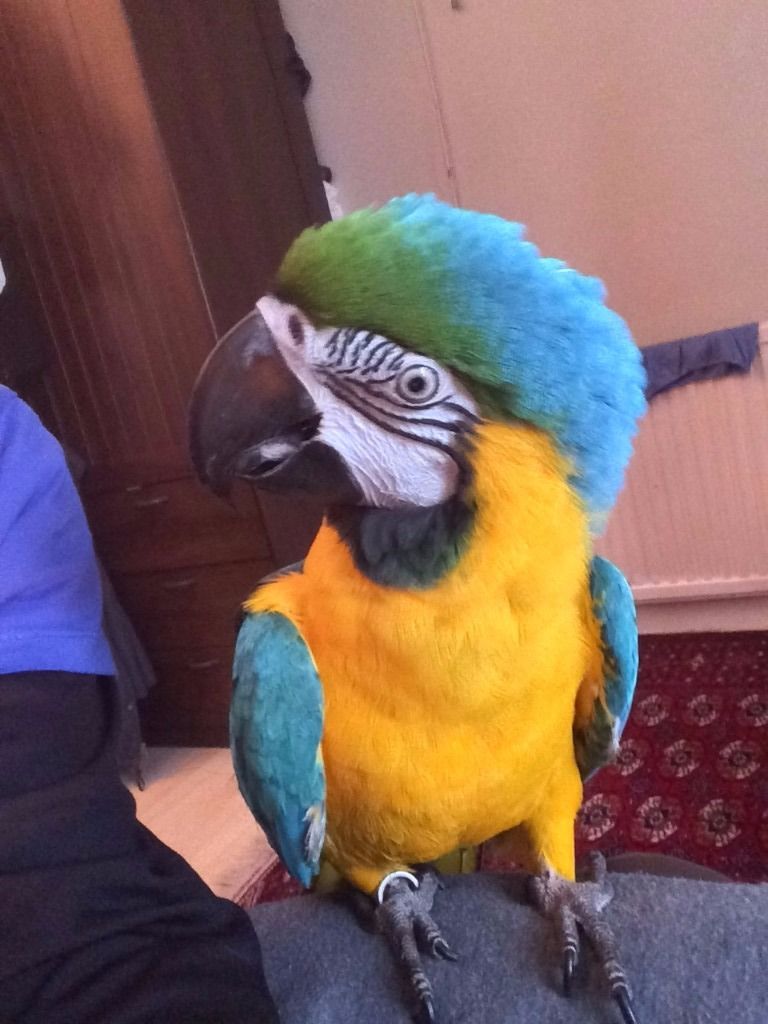 Beautiful blue and gold macaw. His name is Rio. He is only 4 years old. So is still learning new things.