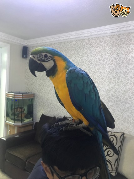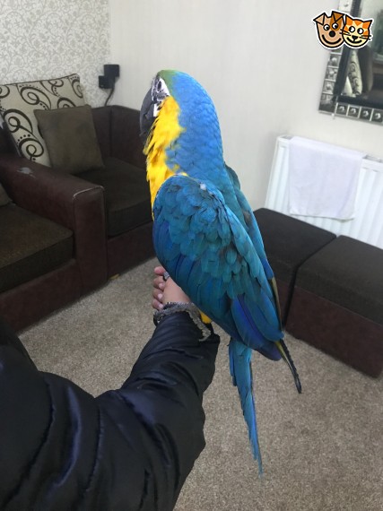 Hi I am selling my stunt 7 months old hand reared baby blue and gold macaw very friendly silly tame closed rung and has DNA paper and hatch certificate goes to anyone comes with a clean large cage which is in good condition for more info please contact thank u