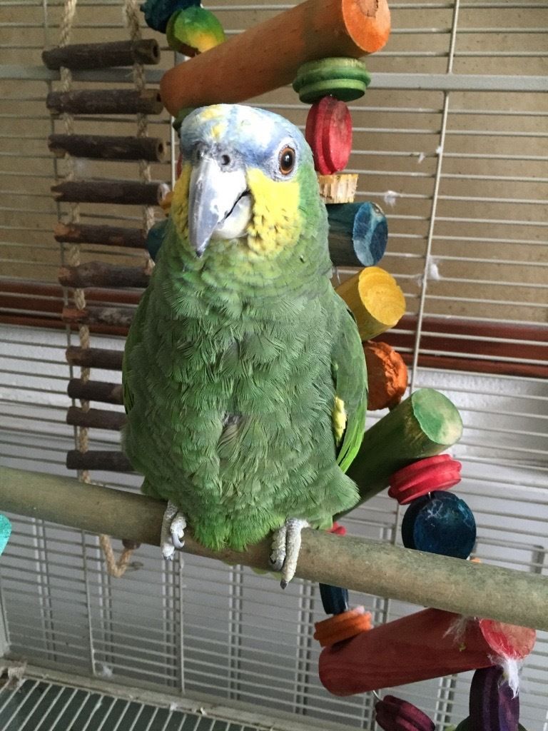 This is Charlie our orange winged Amazon. He came to us a while ago after his owner passed away. Although not hand tame he loves a good head stroke, and I'm sure he would become tamer with time dedicated to him. We have other birds, so haven't got the time he needs , hence the sale. He's a healthy bird, with a great appetite , you name it he will eat it!! We believe him to be around 18 years old