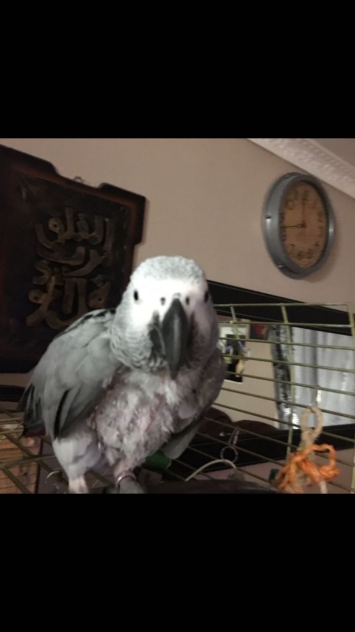Lively and energetic African grey parrot with its own cage, tamed to a degree and can say a few words, friendly with kids.