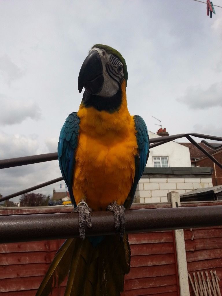 Beautiful blue and gold macaw. His name is Rio. He is only 4 years old. So is still learning new things.