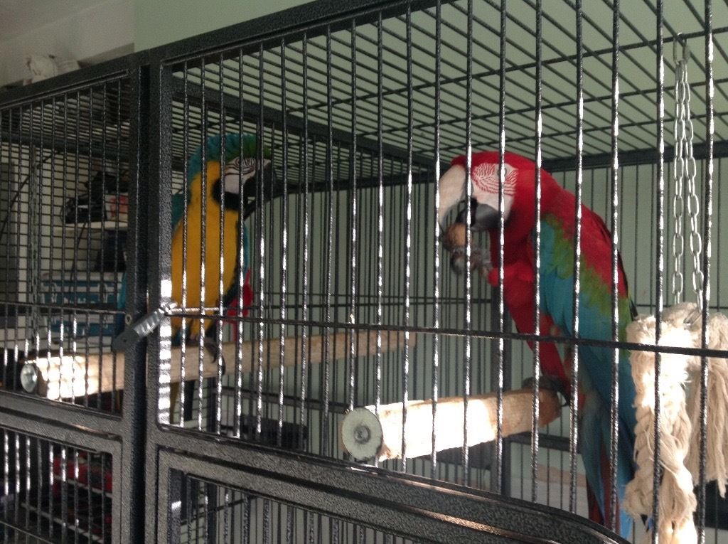 One is a blue and gold macaw (Zazu) and the other is a green wing macaw (poppy)
