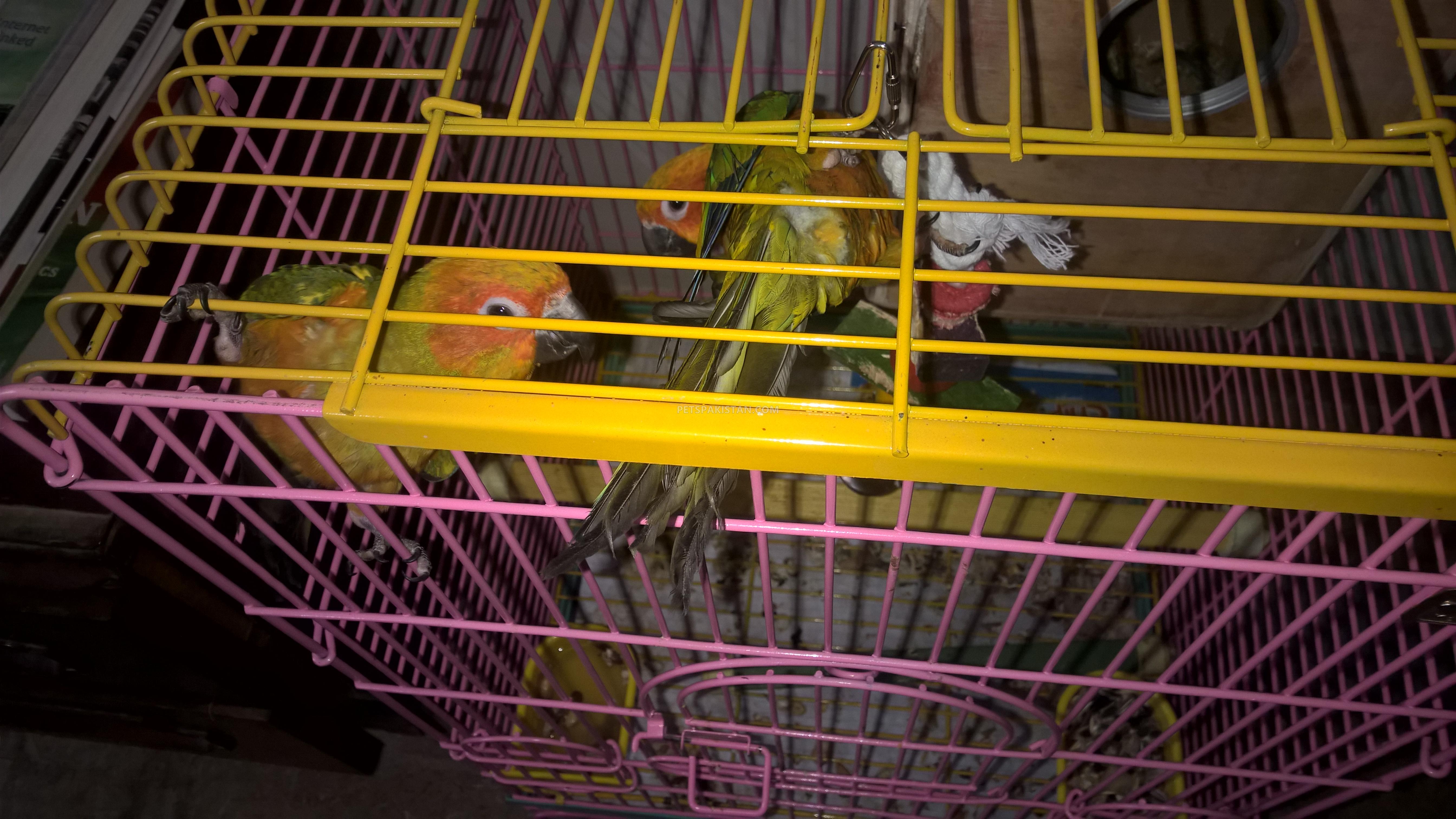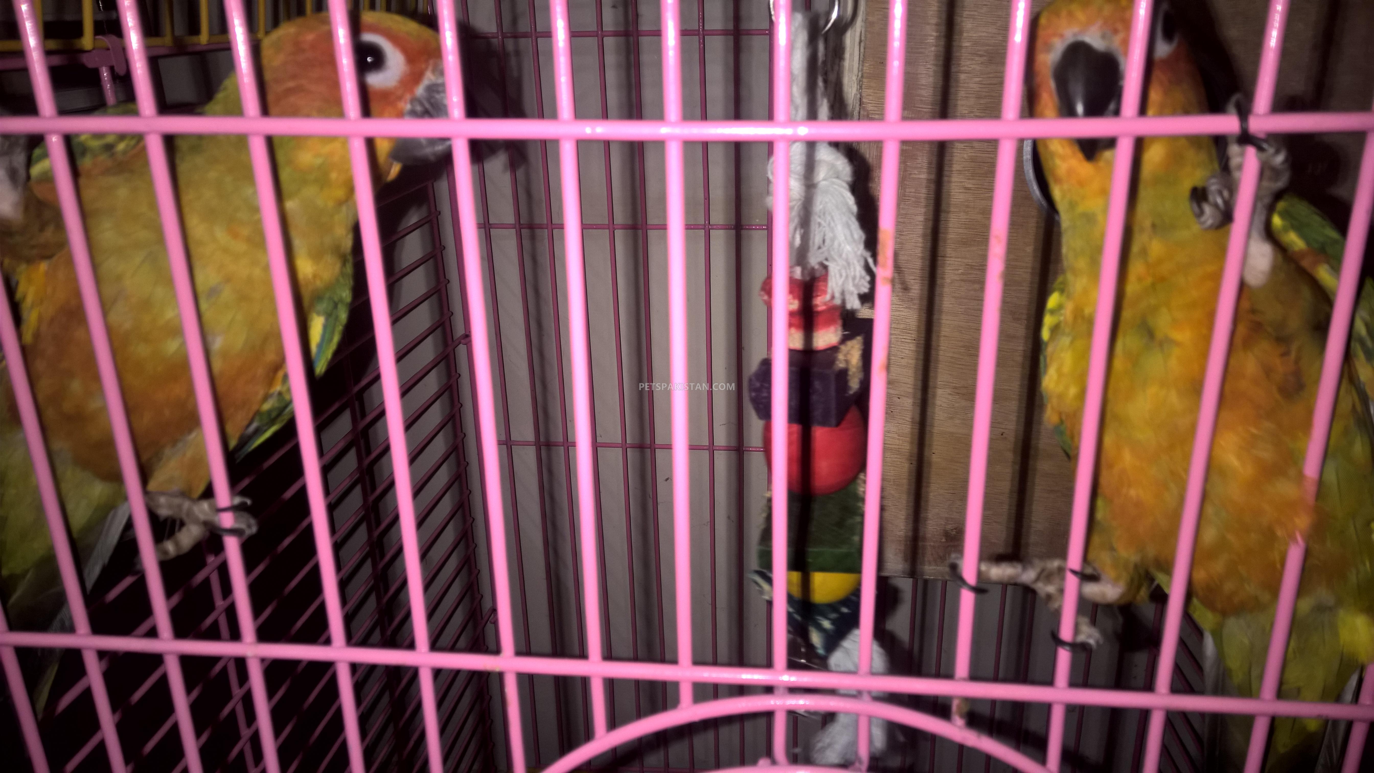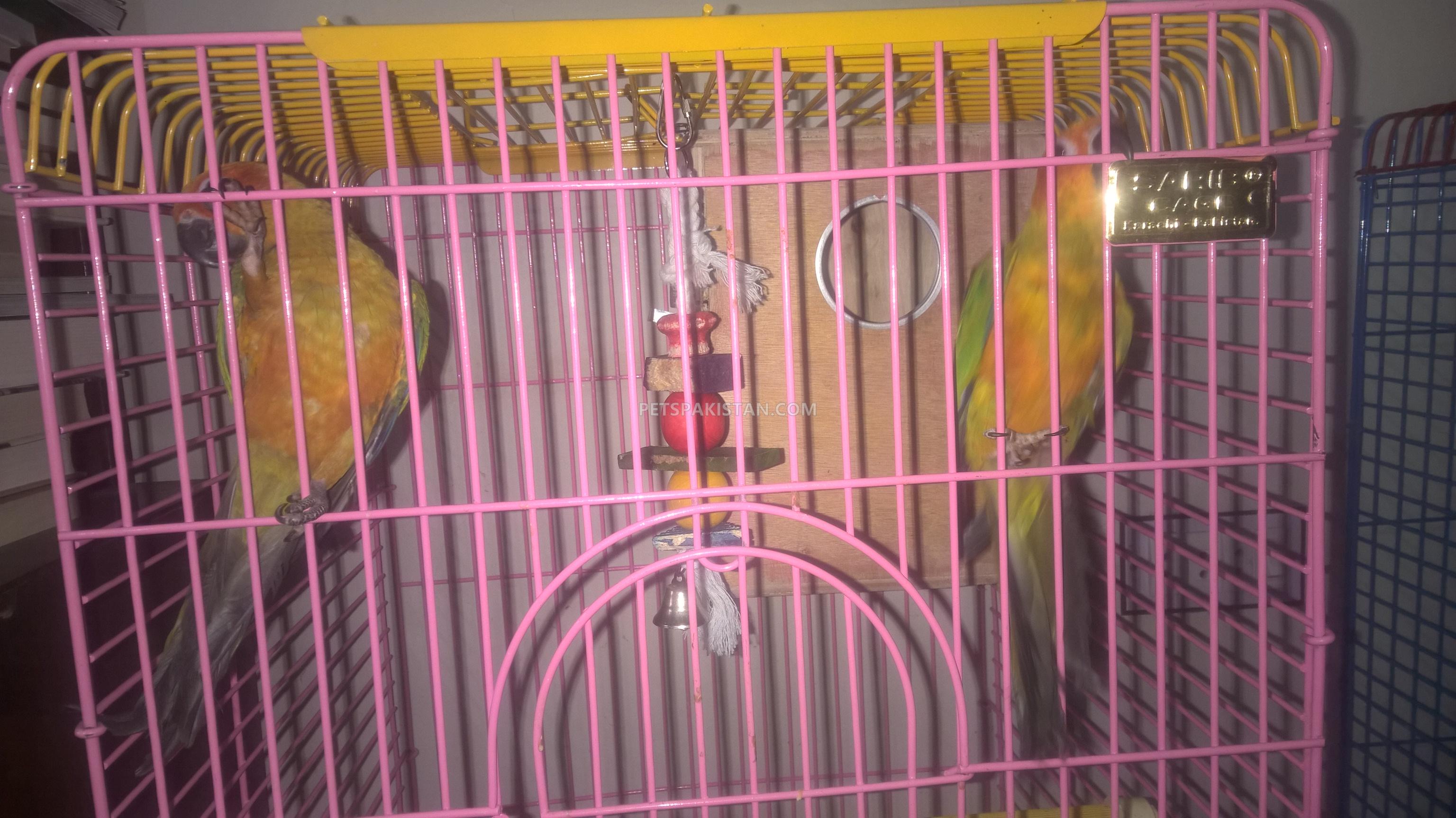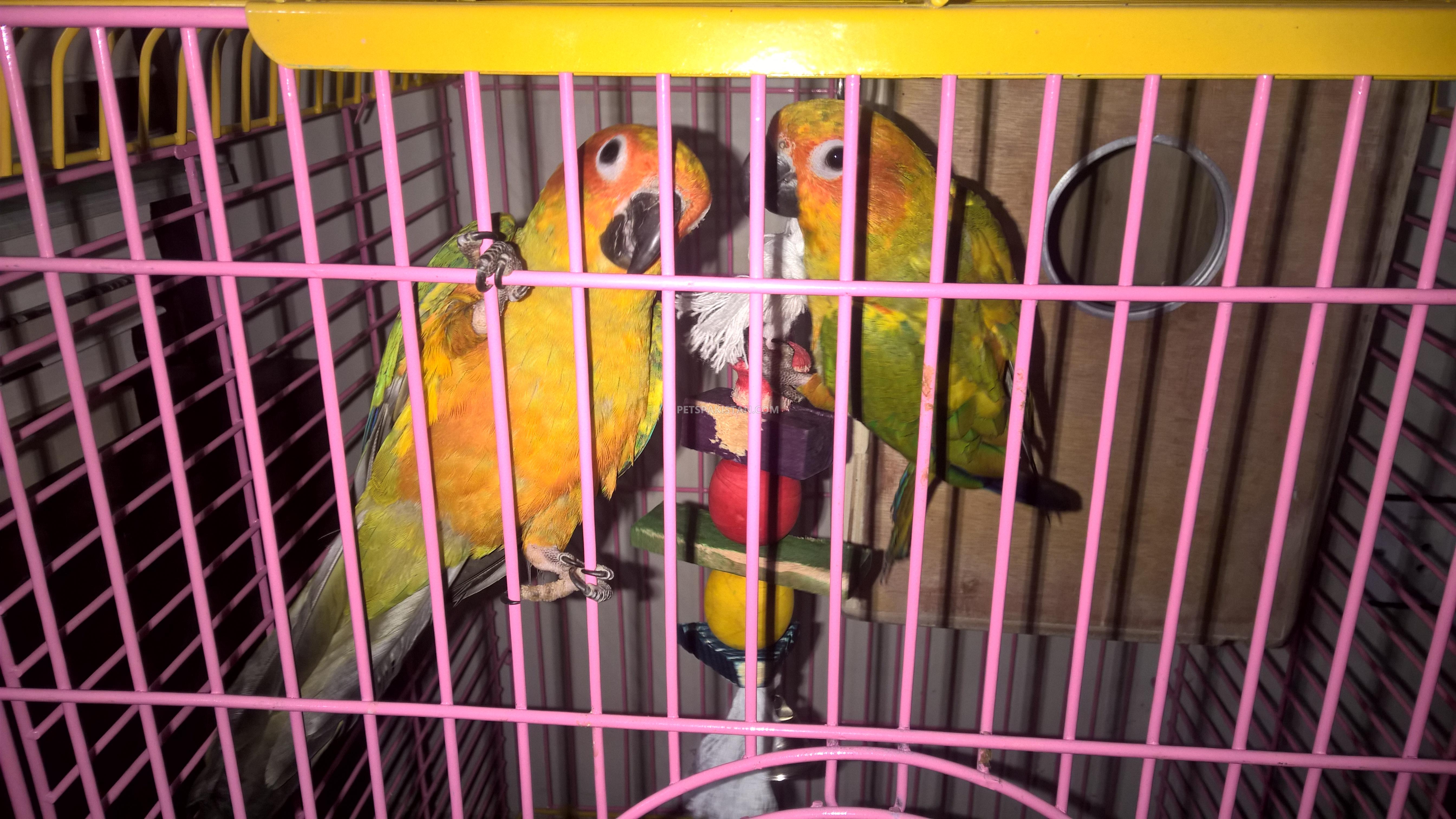 A YOUNG SUN CONURE PAIR WITH CAGE
