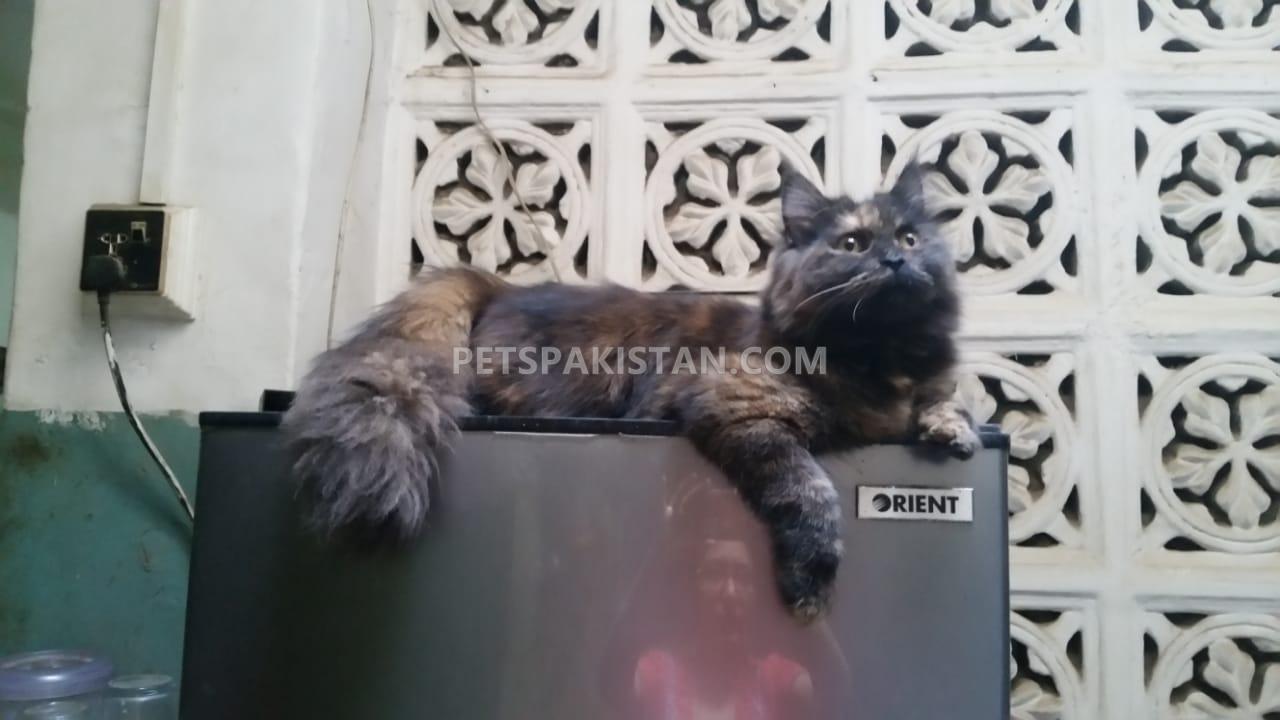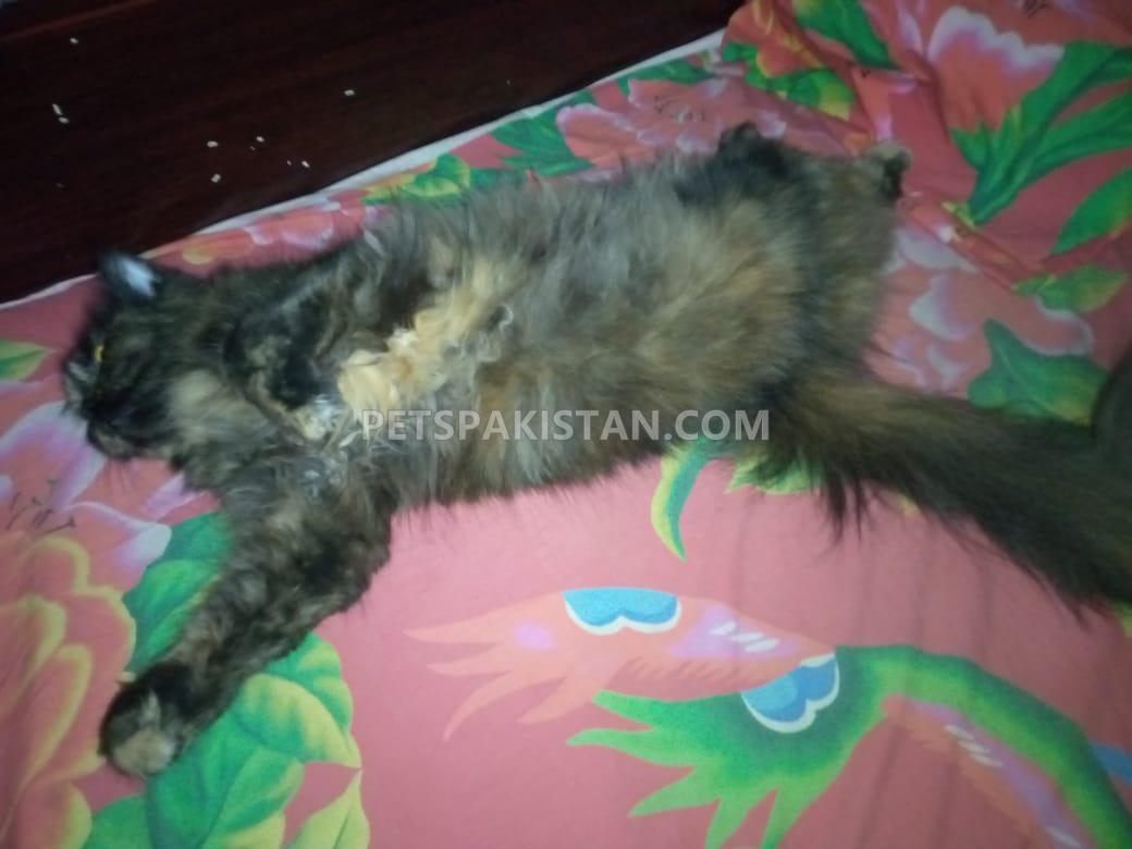 This black plus golden color cat is pure persian breed and heavy fur MASHA ALLAH. she is female of 1.5 years old and neutered. completely healthy and friendly nature. We are selling her because dont have time to care her properly, Only caring family can contact us.
